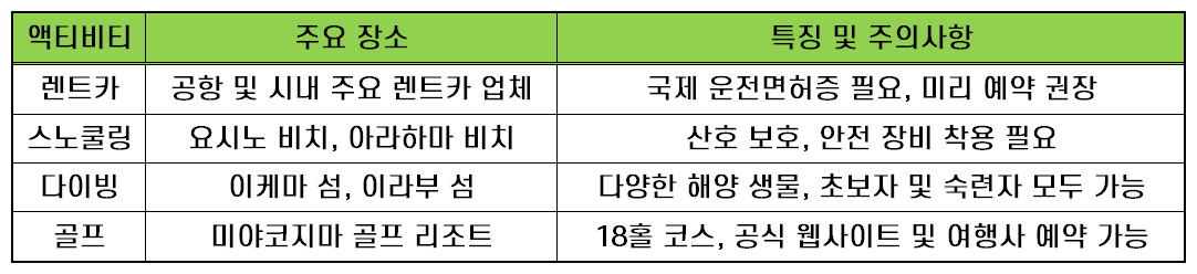 - 액티비티: 렌트카, 스노쿨링, 다이빙, 골프 등 다양한 즐길 거리